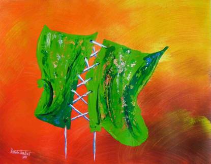 Der linke Bildbereich gibt dem Werk durch seinen blaugruenen Farbton die